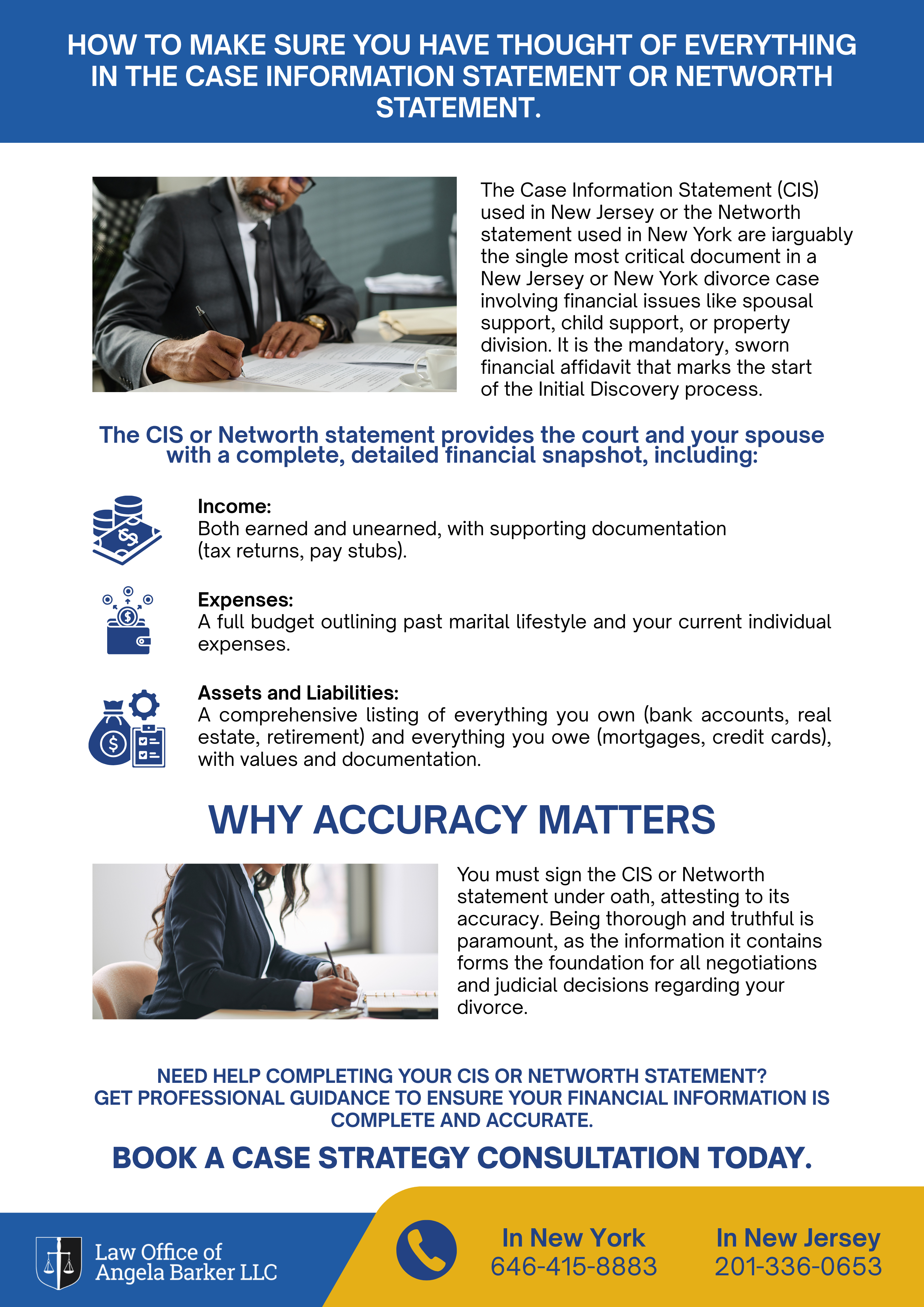 The Case Information Statement (CIS) used in New Jersey or the Networth statement used in New York are iarguably the single most critical document in a New Jersey or New York divorce case involving financial issues like spousal support, child support, or property division.